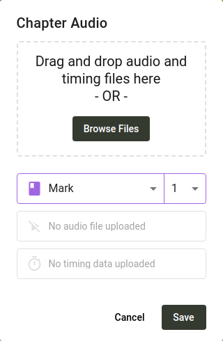 Scripture Forge kann eine Audioaufnahme von jedem Textabschnitt für Überprüfer der Zielgruppe abspielen. Dazu musst Du für jedes Kapitel eine Audiodatei und eine Zeitdatei hochladen. Zeitdateien erlauben es Scripture Forge jeden Vers hervorzuheben, während er gesprochen wird.