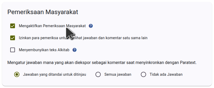 Untuk menggunakan pemeriksaan masyarakat Scripture Forge, Anda harus terlebih dahulu masuk ke Scripture Forge menggunakan akun Paratext Anda dan Hubungkan proyek Anda. Setelah proyek Anda terhubung, navigasikan ke Pengaturan dan gulir ke bawah ke bagian Pemeriksaan Masyarakat. Pastikan kotak centang "Aktifkan Pemeriksaan Masyarakat" dipilih seperti yang ditunjukkan pada gambar di bawah ini